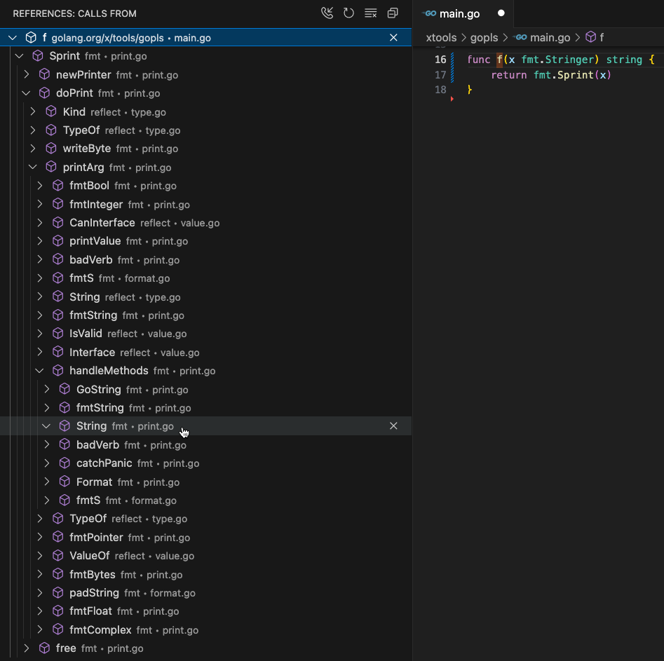 以下のスクリーンショットは、f を根とする発信呼び出しツリーを示しています。このツリーは、f から fmt.Sprint の内部を経て fmt.Stringer の String メソッドへのパスを示すために展開されています。