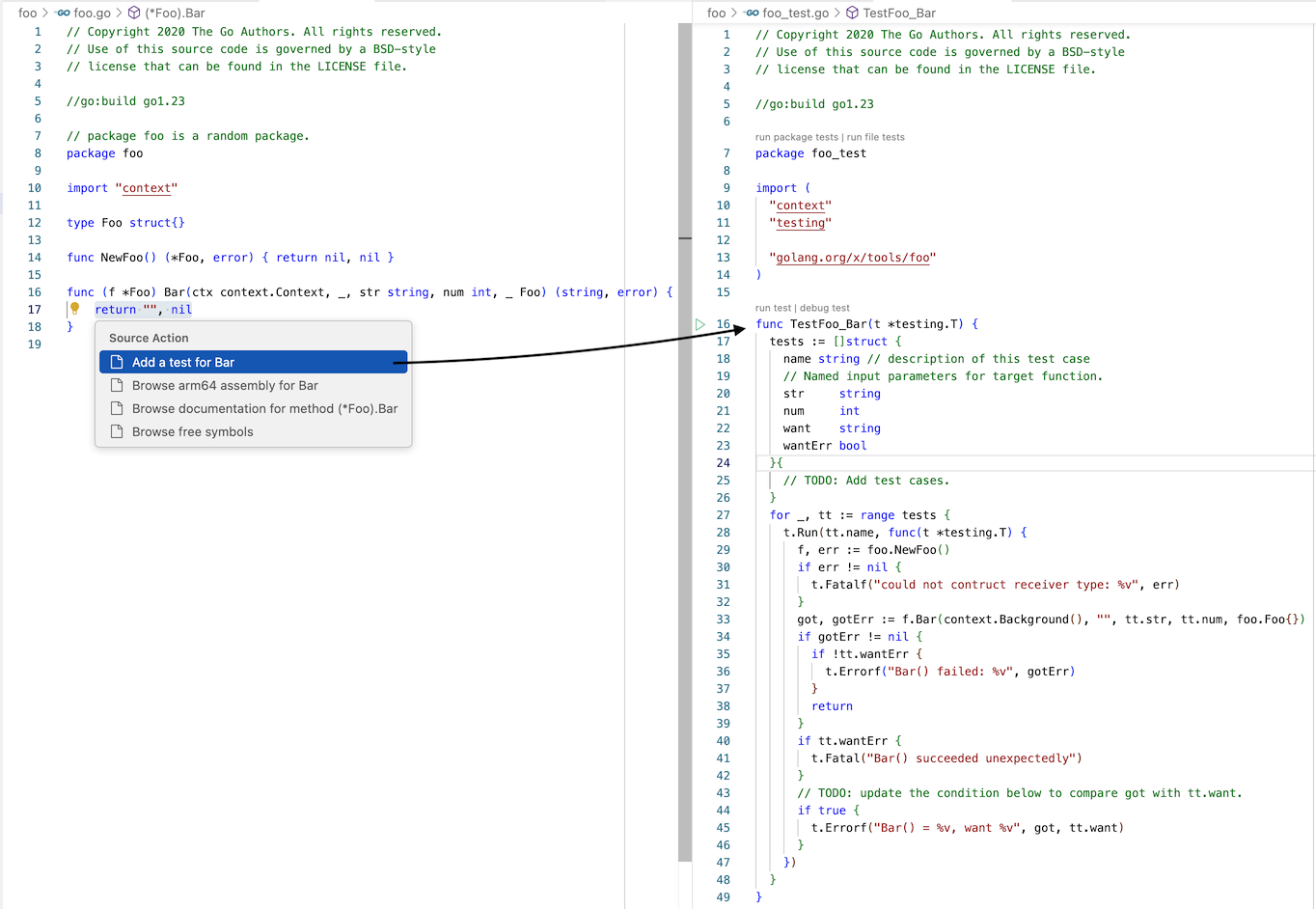 選択されたコードの塊が関数またはメソッド宣言Fの一部である場合、goplsは「Add test for F」コードアクションを提供します。これは、対応する_test.goファイルに選択された関数の新しいテストを追加します。生成されたテストは、入力パラメータと結果を含むそのシグネチャを考慮します。