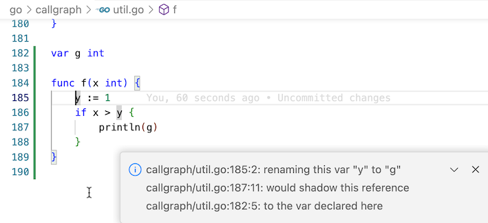 Goplsの名前変更アルゴリズムは、名前変更がコンパイルエラーを引き起こす可能性がある状況を検出するために細心の注意を払います。例えば、名前を変更すると、シンボルが「シャドウ」され、既存の参照の一部がスコープ外になることがあります。Goplsはエラーを報告し、シンボルのペアとシャドウされた参照を通知します。